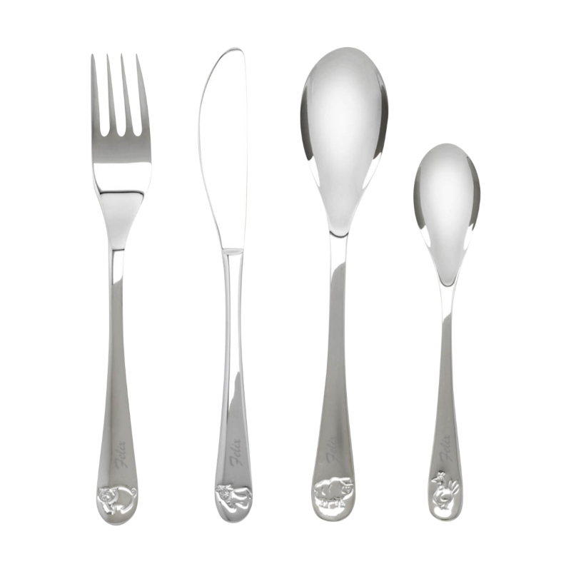 Das Kinderbesteck ist aus rostfreiem Stahl und spülmaschinentauglich. Das Besteck wird auf der Vorderseite graviert.