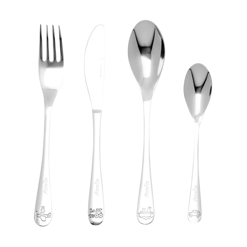 Das Kinderbesteck ist aus rostfreiem Stahl und spülmaschinentauglich. Das Besteck wird auf der Vorderseite graviert.