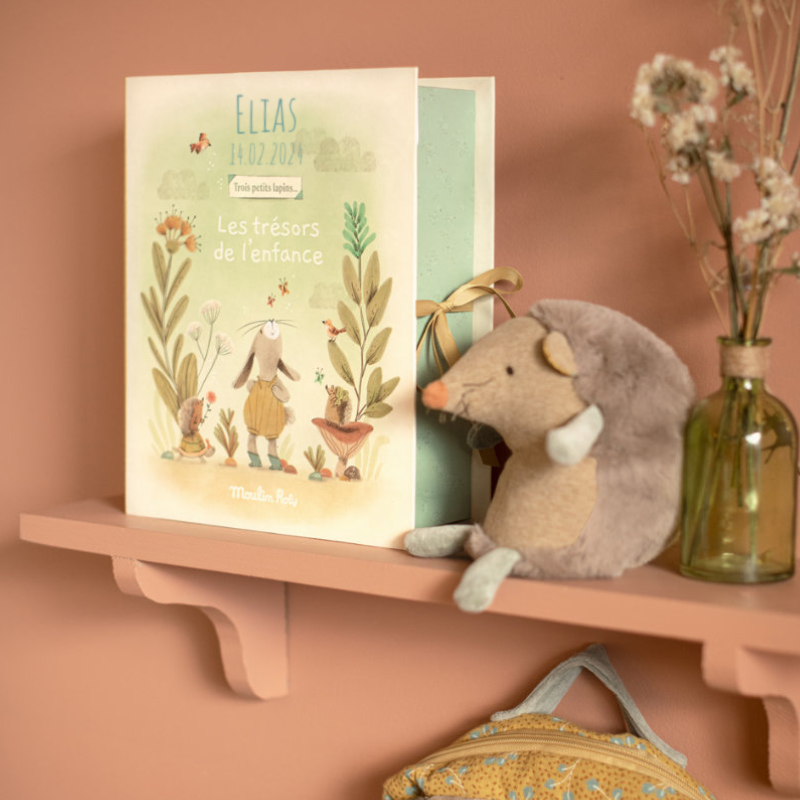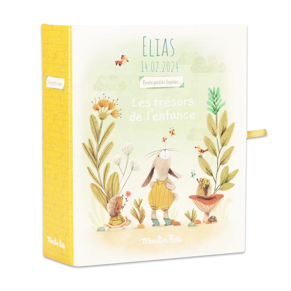 Süsser, kleiner Koffer, um all die ersten Dinge deines Kindes aufzubewahren. Viele Fächer für die ersten Schuhe, Lätzchen, Haarsträhne, Zähnchen, Geburtsband und viele andere Erinnerungen. Die Box ist auf Französisch beschriftet.