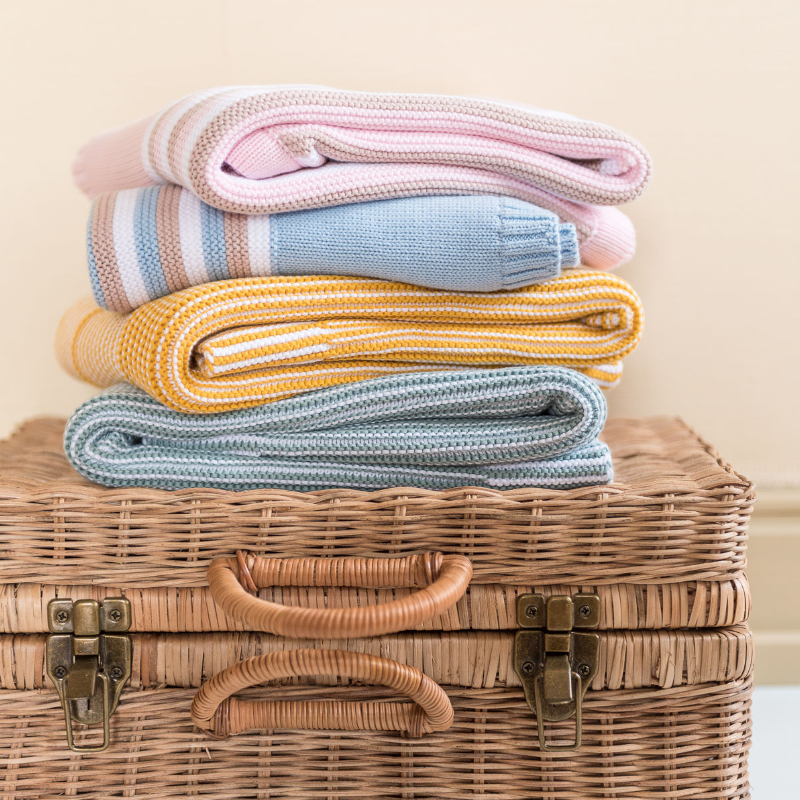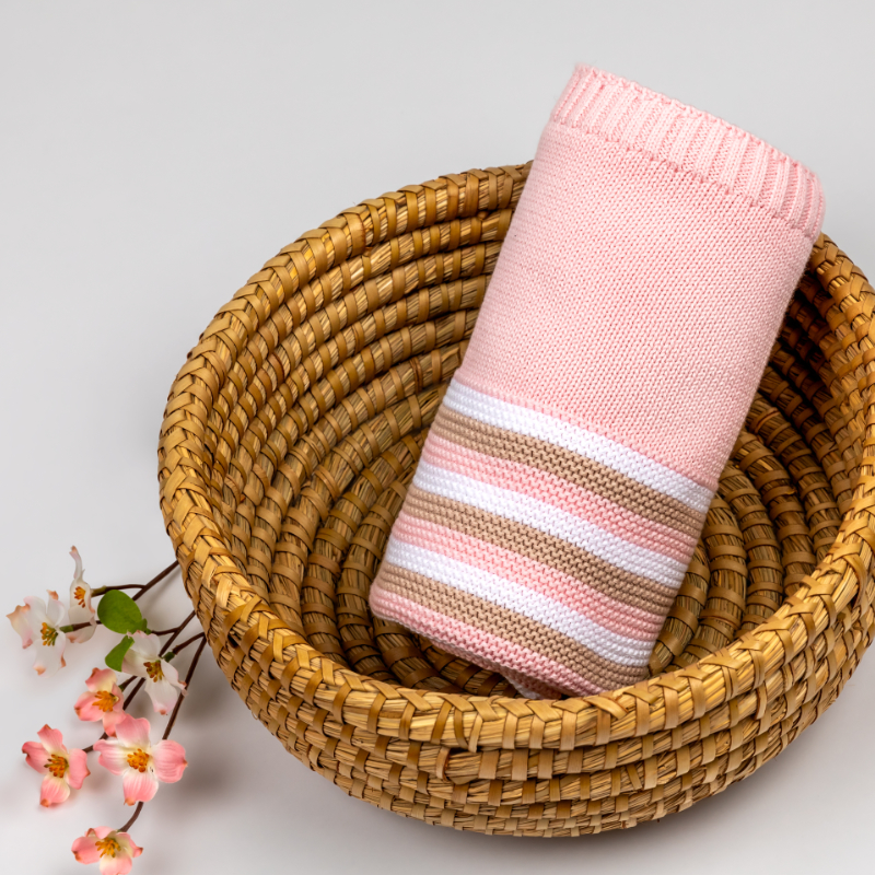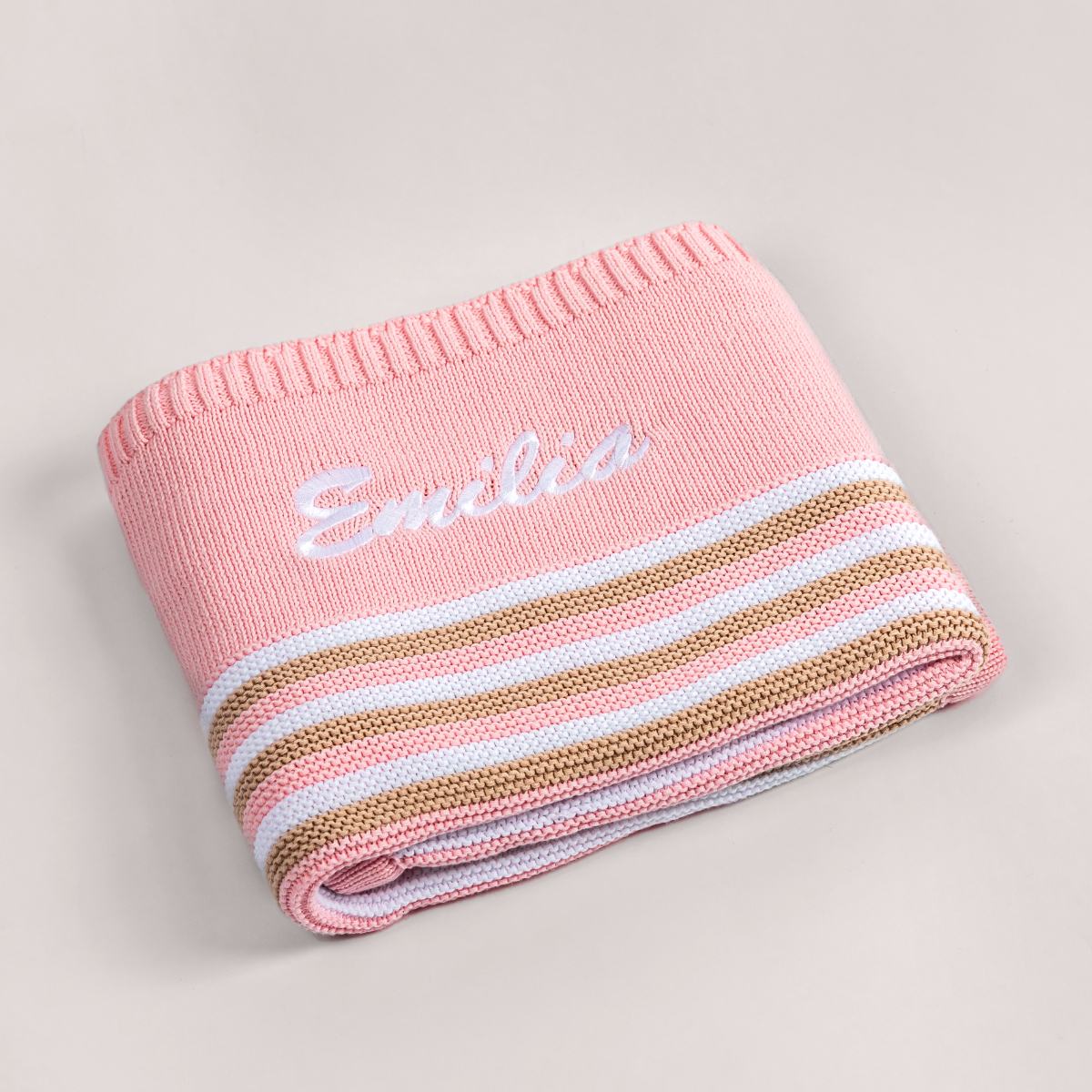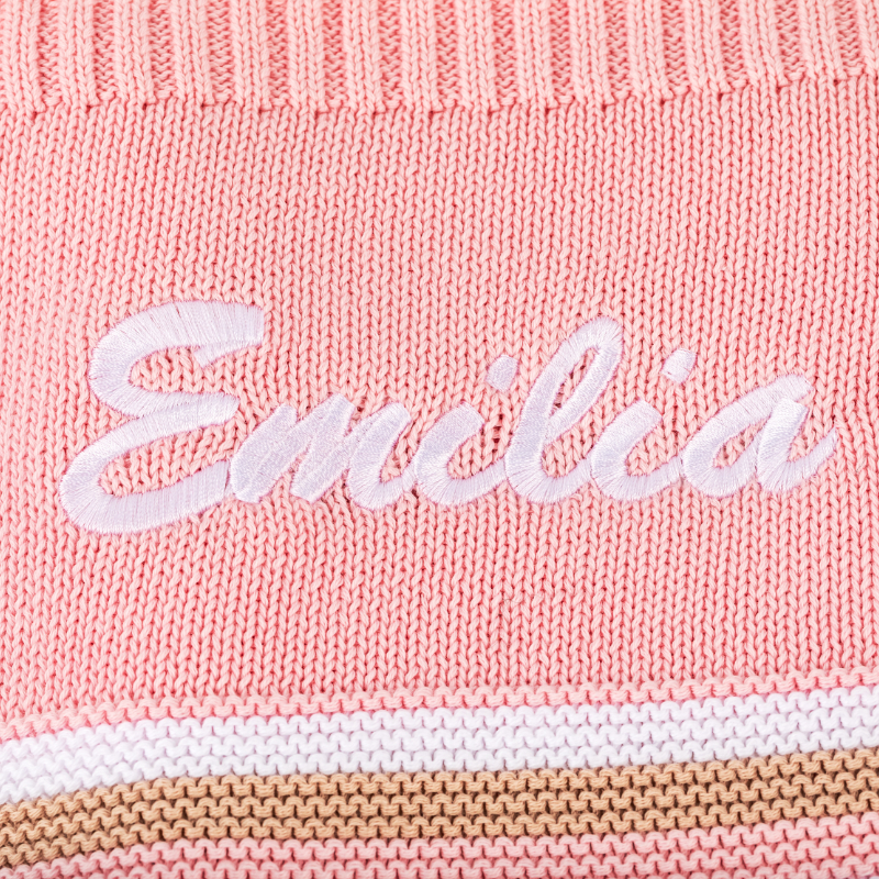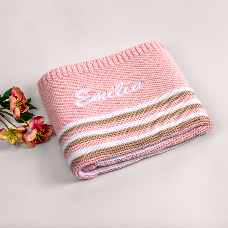 Die entzückende Strickdecke in rosa mit weissen und beigen Streifen ist perfekt, um Ihre kleine Prinzessin einzuwickeln und sie warm zu halten. Diese schützende Babydecke mit Namen ist ein ideales Geschenk zur Geburt.