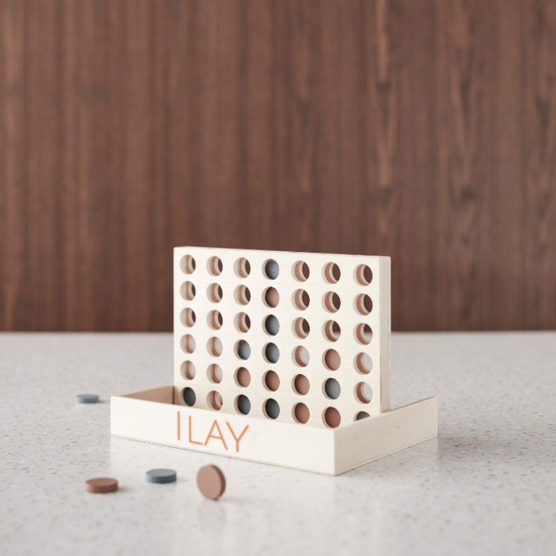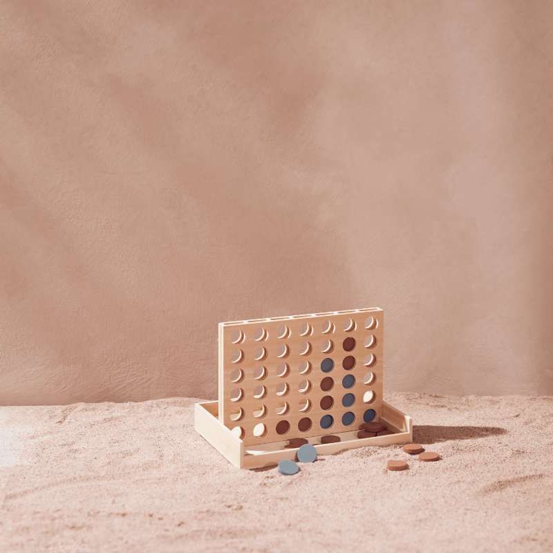 Hochwertiges Holzspiel. Wähle die grünen oder dunkelroten Scheiben. Hast du 4 Scheiben in einer Reihe, egal ob vertikal, horizontal oder diagonal, dann gewinnst du.
