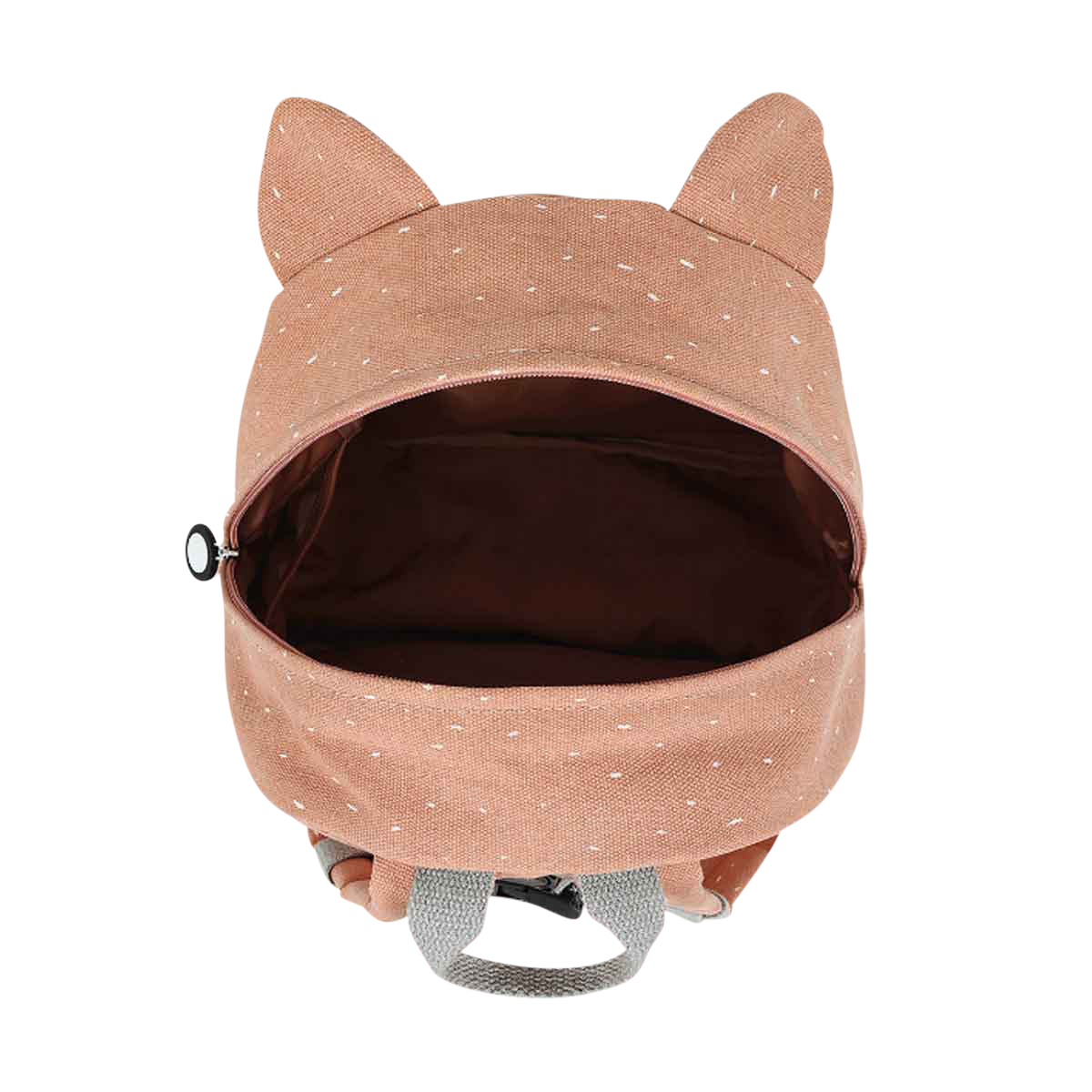 Der Rucksack hat an der Vorderseite eine kleine Tasche und die Reissverschlüsse haben einen grossen Schieber, damit sie auch von Kindern leicht zu öffnen und schliessen sind. An der Innenseite hat der Rucksack ebenso ein Namensschild.