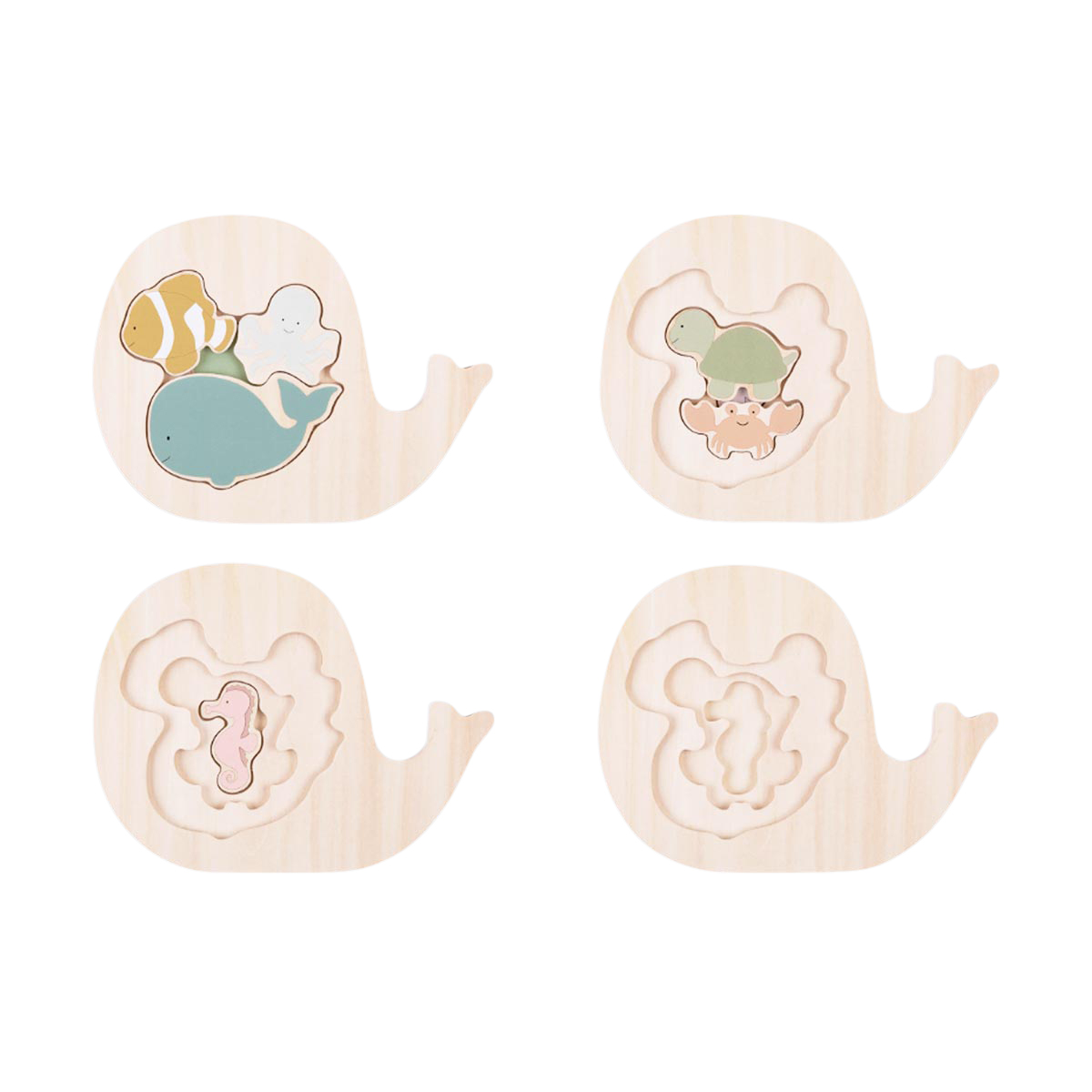 Ein lustiges Holzpuzzle in verschiedenen Schichten. Sechs verschiedene Figuren bilden die Puzzleteile. Die Figuren sind so geformt, dass sie in deine kleinen Hände passen und leicht zu greifen sind. Eine lustige und herausfordernde Art zu puzzeln.