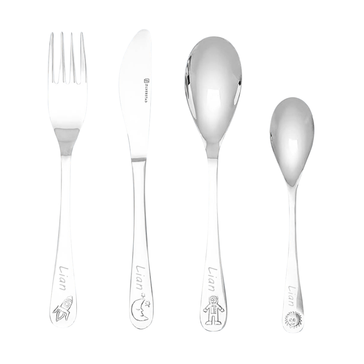Dieses 4-teilige Kinderbesteck bring diesen Traum ein Stückchen näher. Das Set besteht aus einer Gabel, einem Messer, einem grossen und einem kleinen Löffel. Auf den Besteckteilen sind ein Astronaut, eine Rakete, die Sonne und der Mond abgebildet.