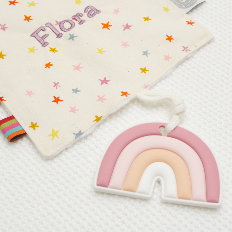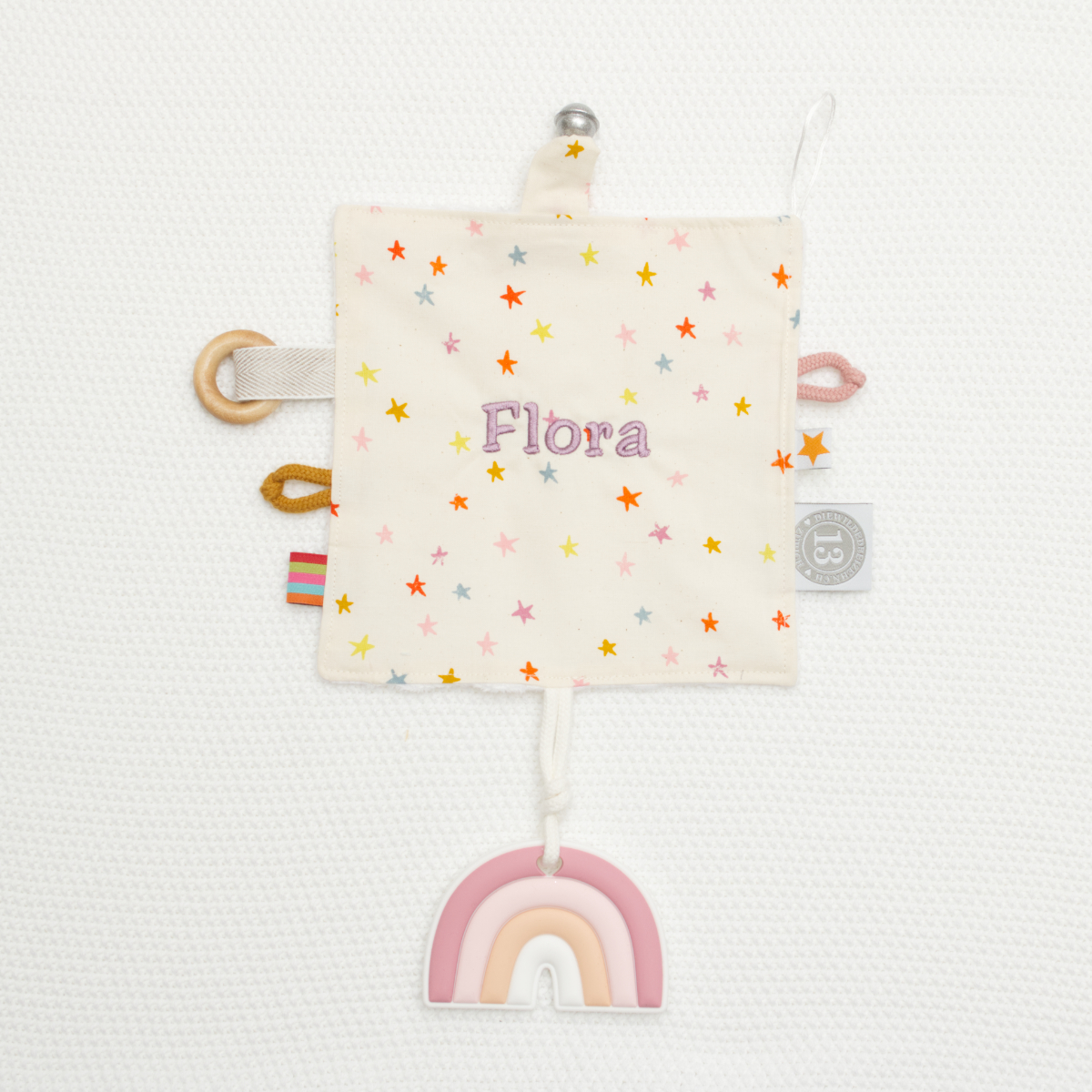 Das Beissspielzeug aus Silikon hilft ausserdem, die Beschwerden beim Zahnen zu lindern. Spielen und Beruhigen damit wird das Knistertuch sicher zum treuesten Begleiter, ob zu Hause oder auf Reisen. An der langen Schlaufe über Eck kann ausserdem ein Nuggi oder ein Clip zum Befestigen (z.B. an der Kleidung oder am Kinderwagen) angebracht werden.