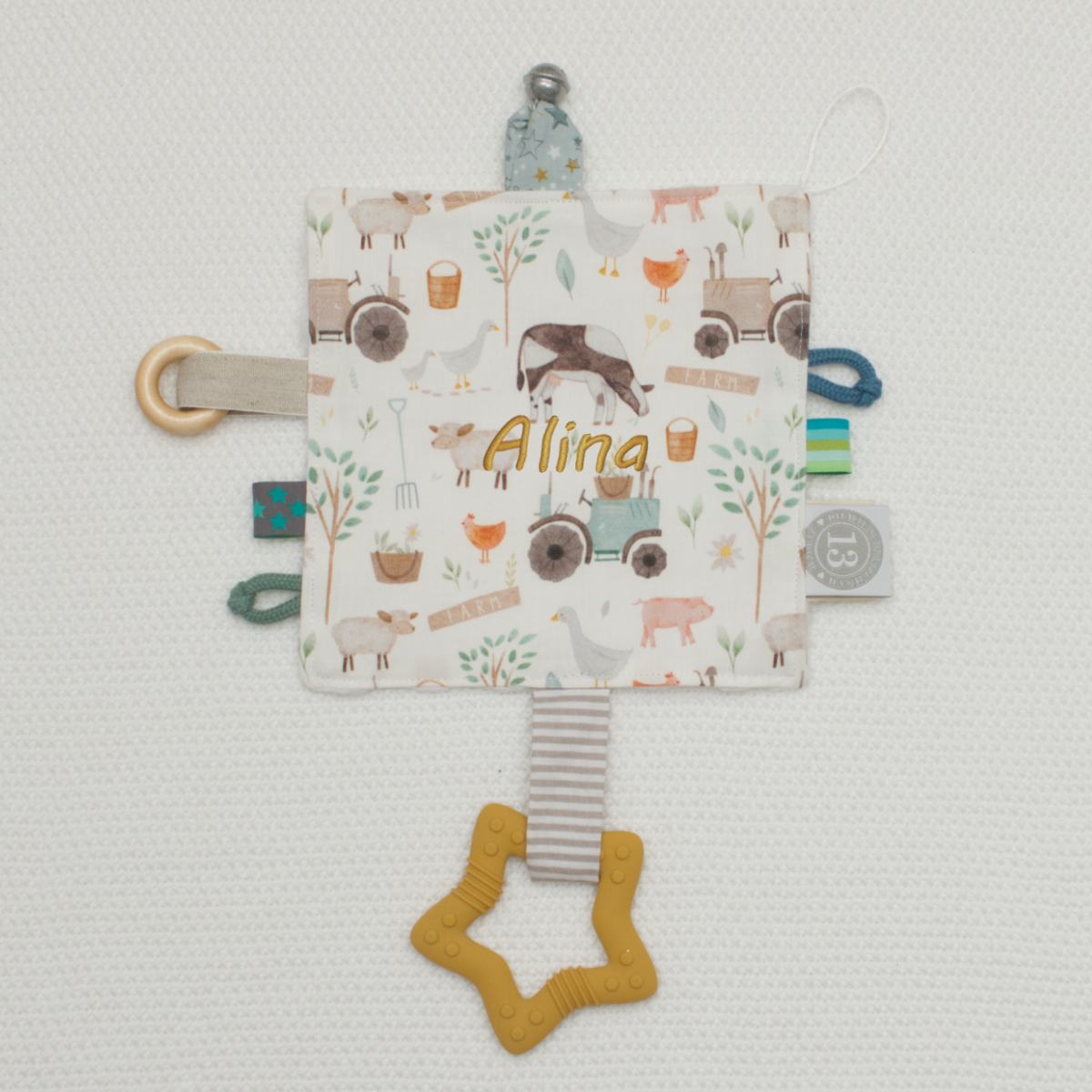Das Beisspielzeug aus Silikon hilft ausserdem die Beschwerden beim Zahnen zu lindern. Spielen und Beruhigen - damit wird das Knistertuch sicher zum treuesten Begleiter ob Zuhause oder auf Reisen. An der langen Schlaufe über Eck kann ausserdem ein Nuggi oder ein Clip zum Befestigen (z.B. an der Kleidung oder am Kinderwagen) angebracht werden.