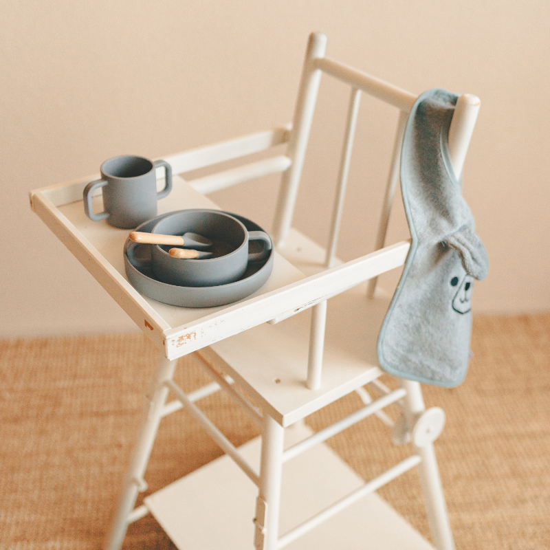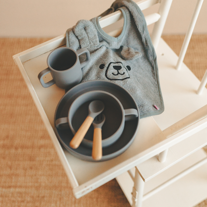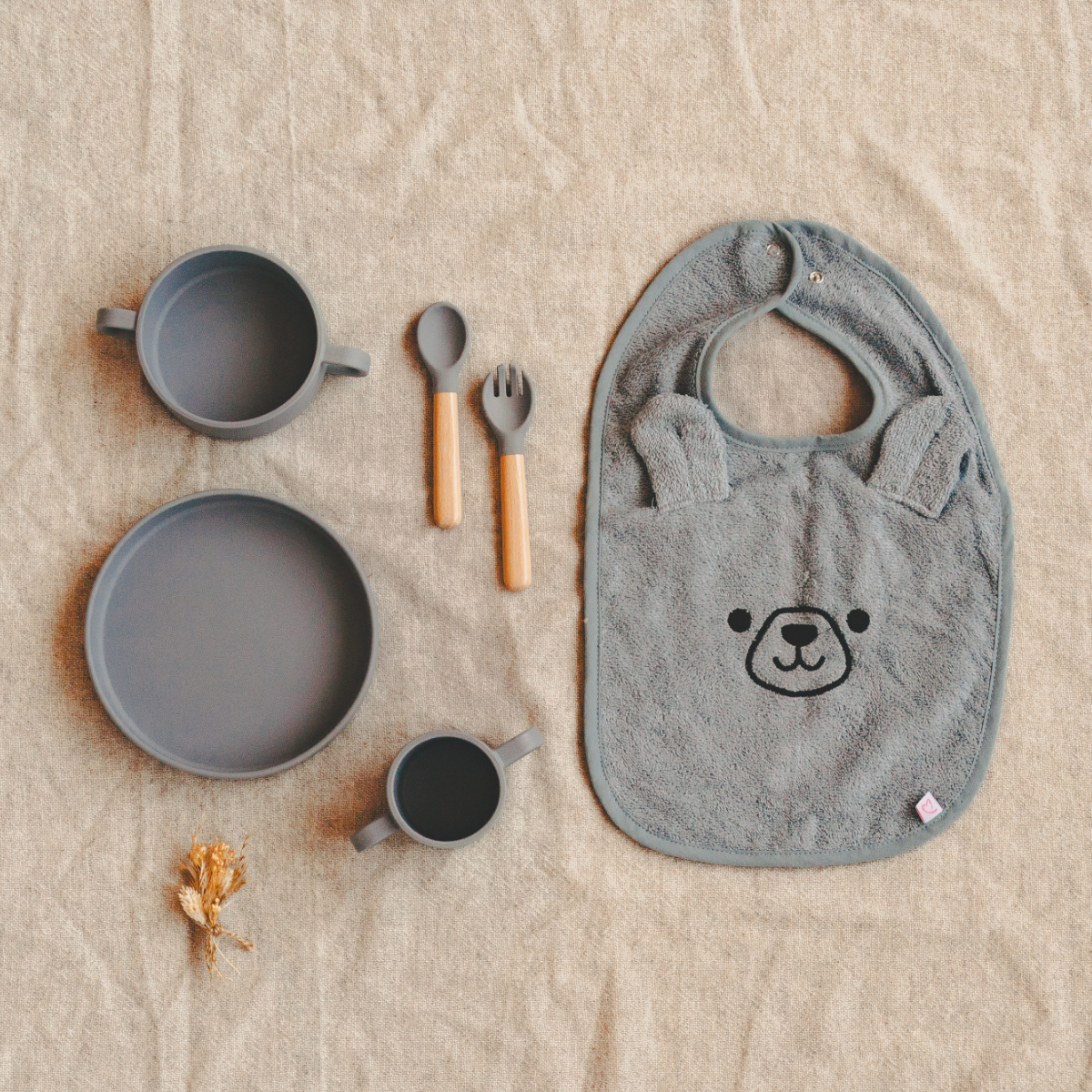 Das Set bestehend aus einem Lätzchen und einem 5-teiligen Silikon-Geschirr-Set eignet sich perfekt als Geschenk.