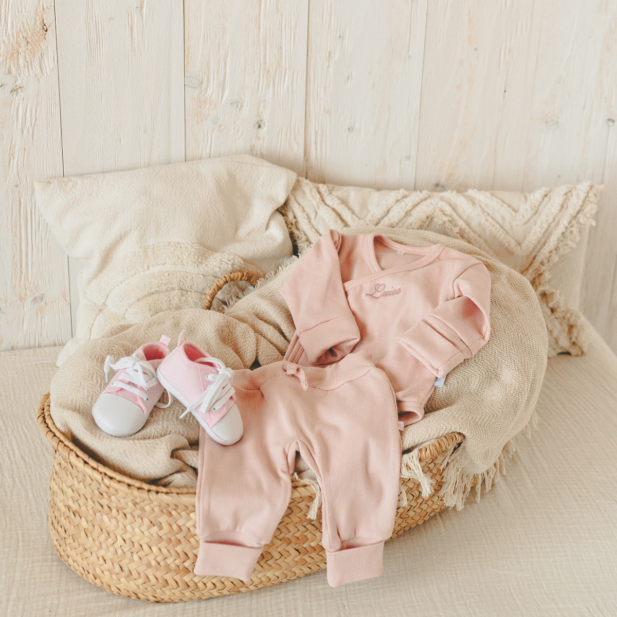 Auf Wunsch besticken wir den Wickelbody und / oder die Babyschuhe mit dem Namen deiner Wahl. So wird das Outfit zu einem einzigartigen, liebevollen Erinnerungsstück.