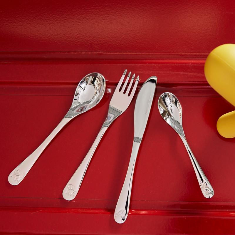 Personalisierung: Das Lätzchen (Bestickung) sowie das Besteck (Gravur) werden mit der Zeile 1 personalisiert.