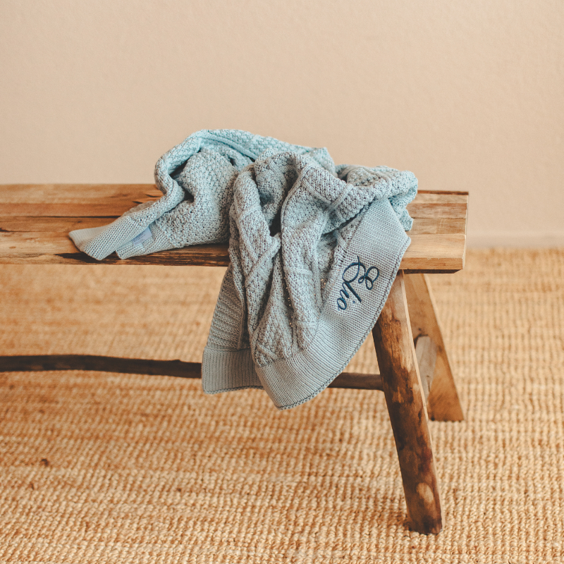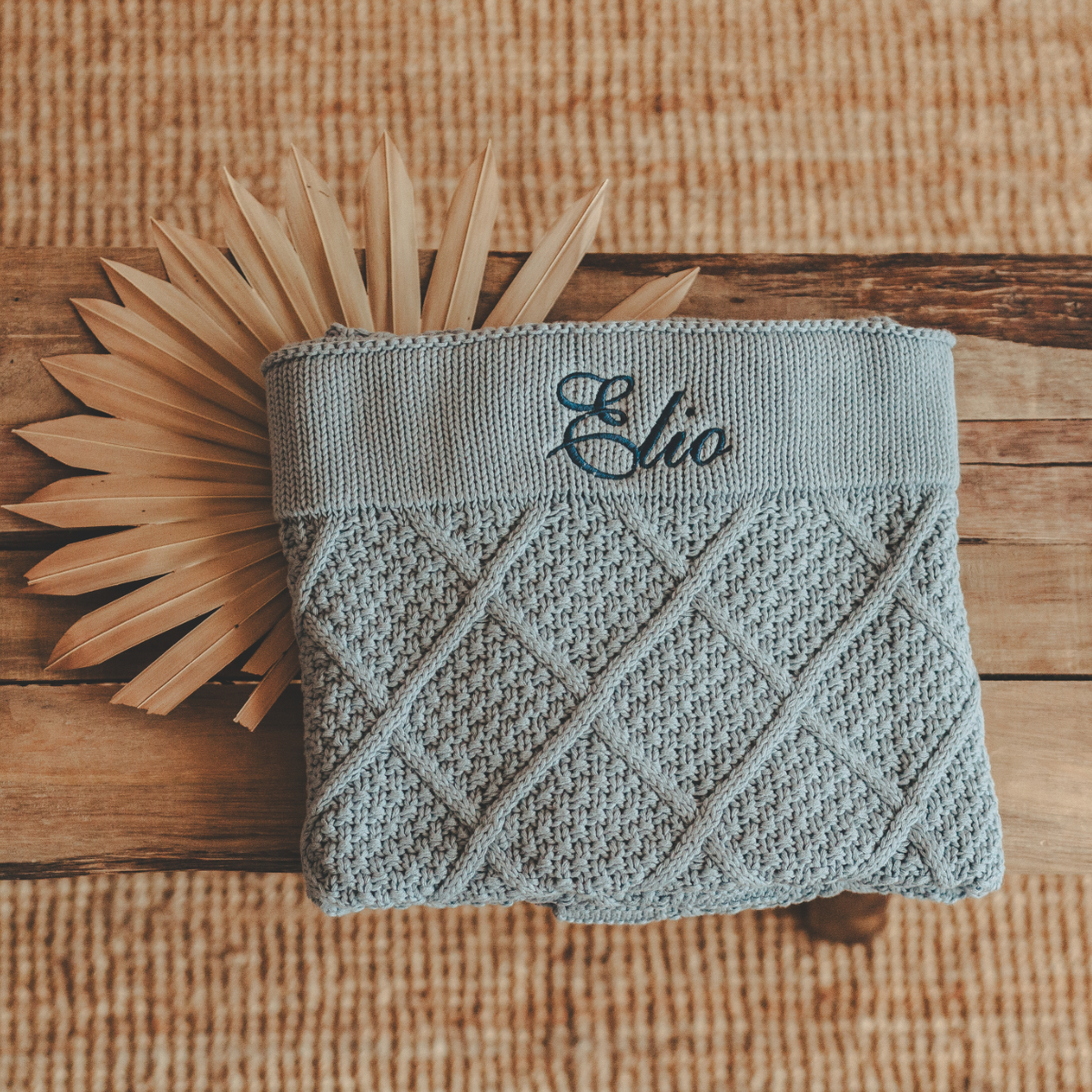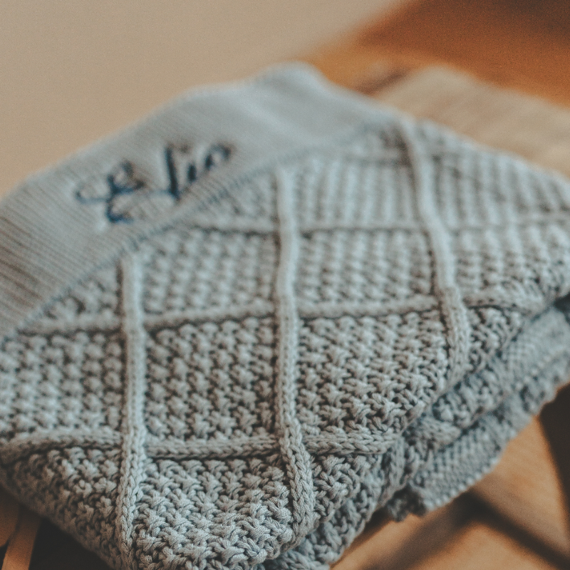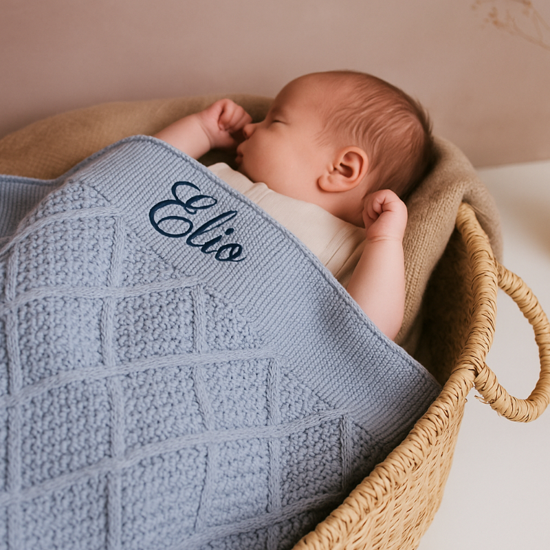 Unsere kuschelige Strickdecke mit liebevollem Rautenmuster ist mehr als nur ein Accessoire – sie ist ein treuer Begleiter für die kostbaren ersten Jahre deines Babys.