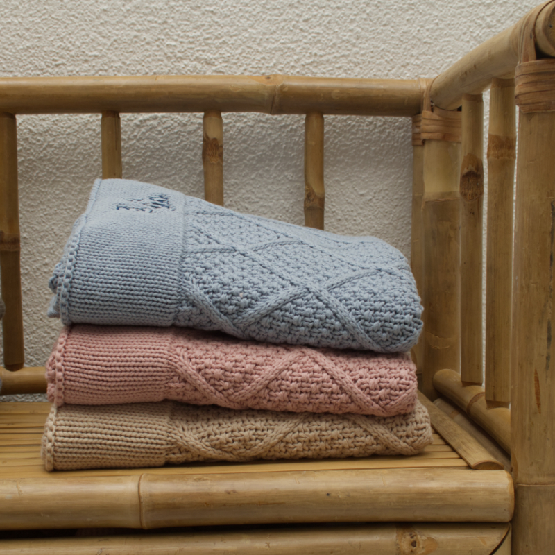 Unsere kuschelige Strickdecke mit liebevollem Rautenmuster ist mehr als nur ein Accessoire – sie ist ein treuer Begleiter für die kostbaren ersten Jahre deines Babys.
