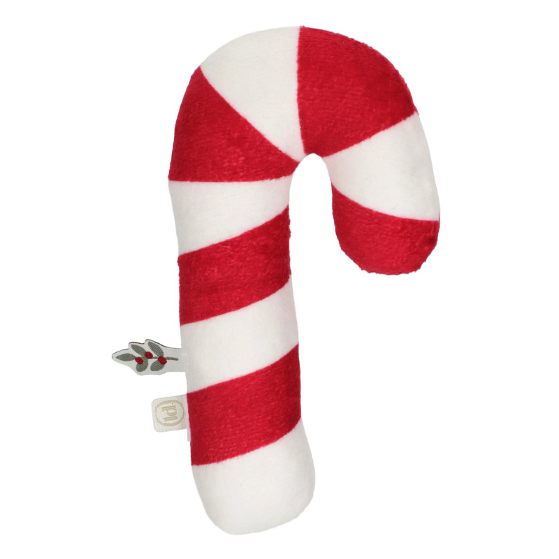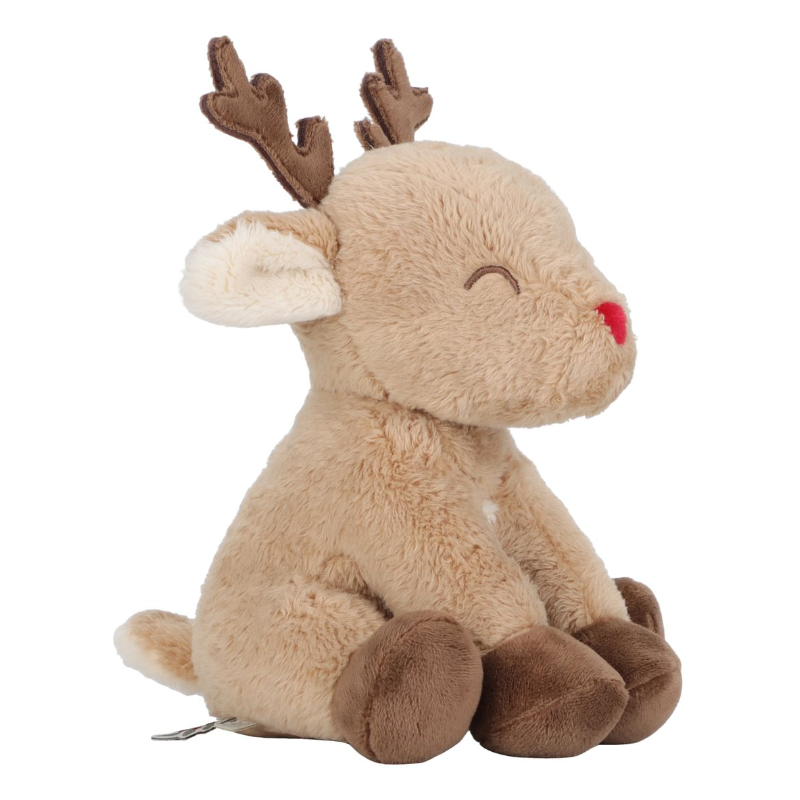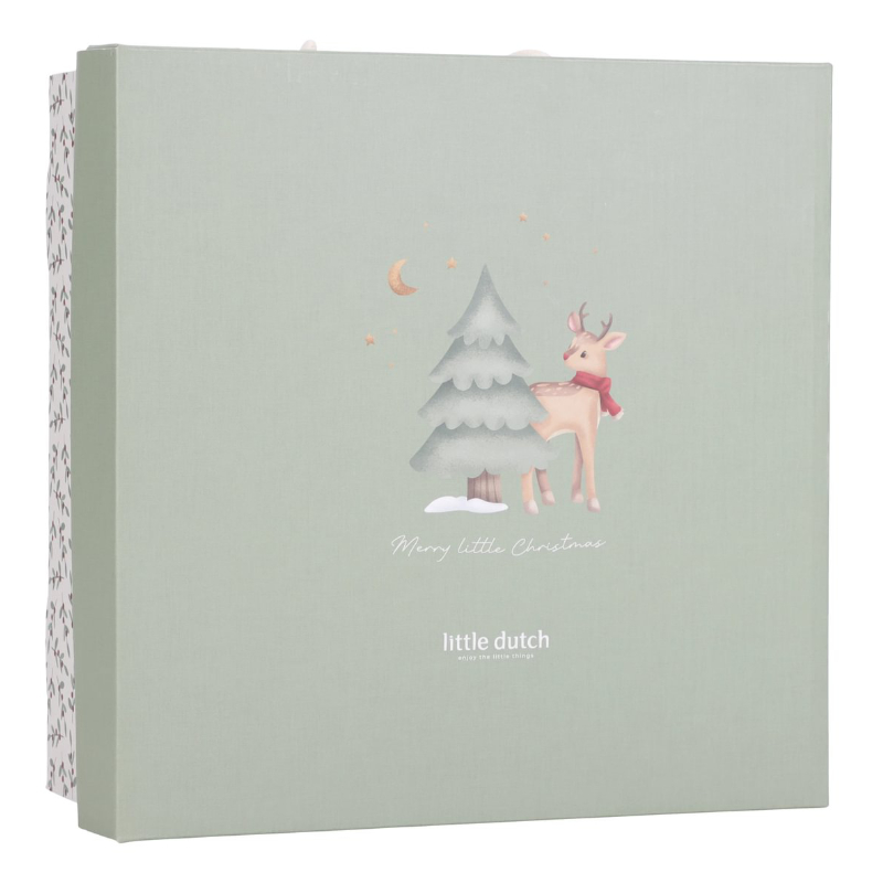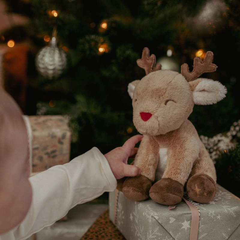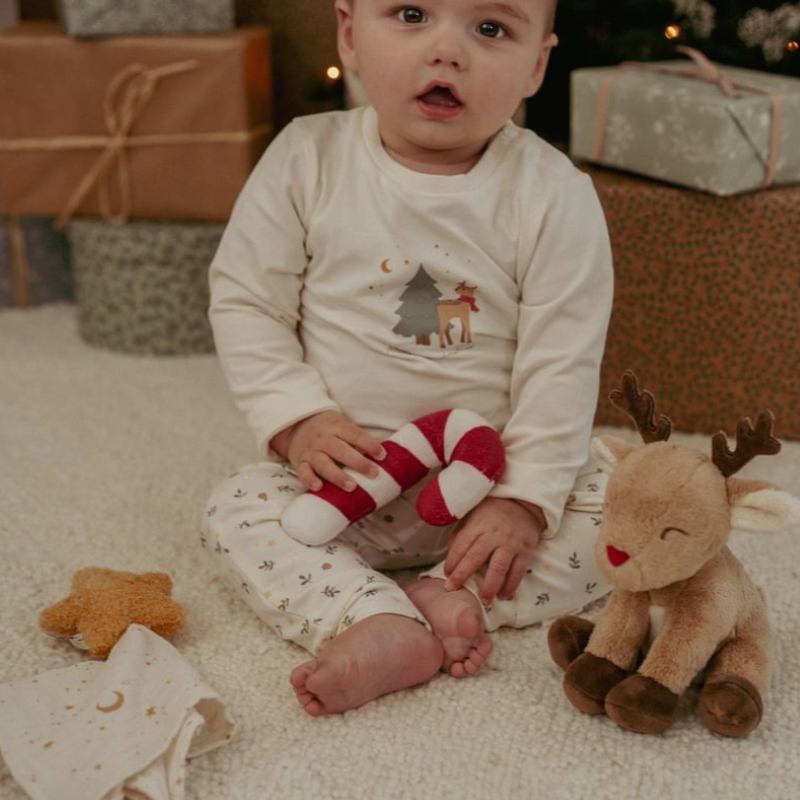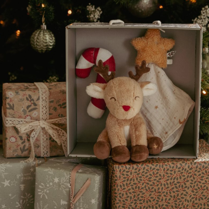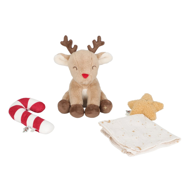 Das süsse Weihnachts-Babygeschenkset in der Box enthält ein Hirsch-Kuscheltier, ein Schmusetuch mit Stern und eine Rassel im Süssigkeitenmotiv.