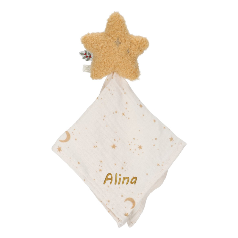 Auf Wunsch besticken wir dir den Namen deines Lieblings auf das Schmusetuch - für einen ganz persönlichen Weihnachtsgruss.
