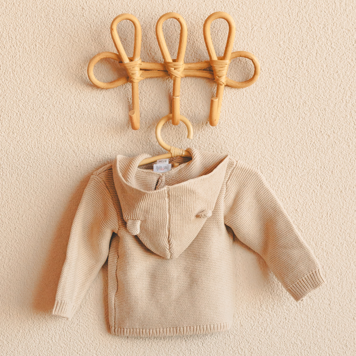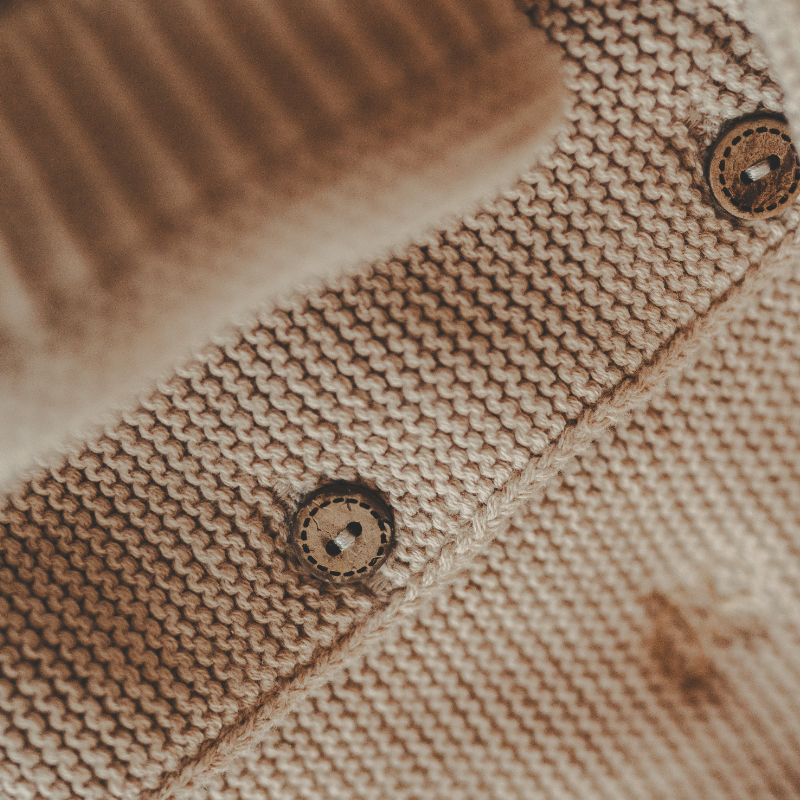 - Hooded cardigan with cute ears made from 100% cotton (Oeko-Tex Standard 100), decorated with natural wooden buttons. Available in two sizes: 3-6 months or 6-12 months.