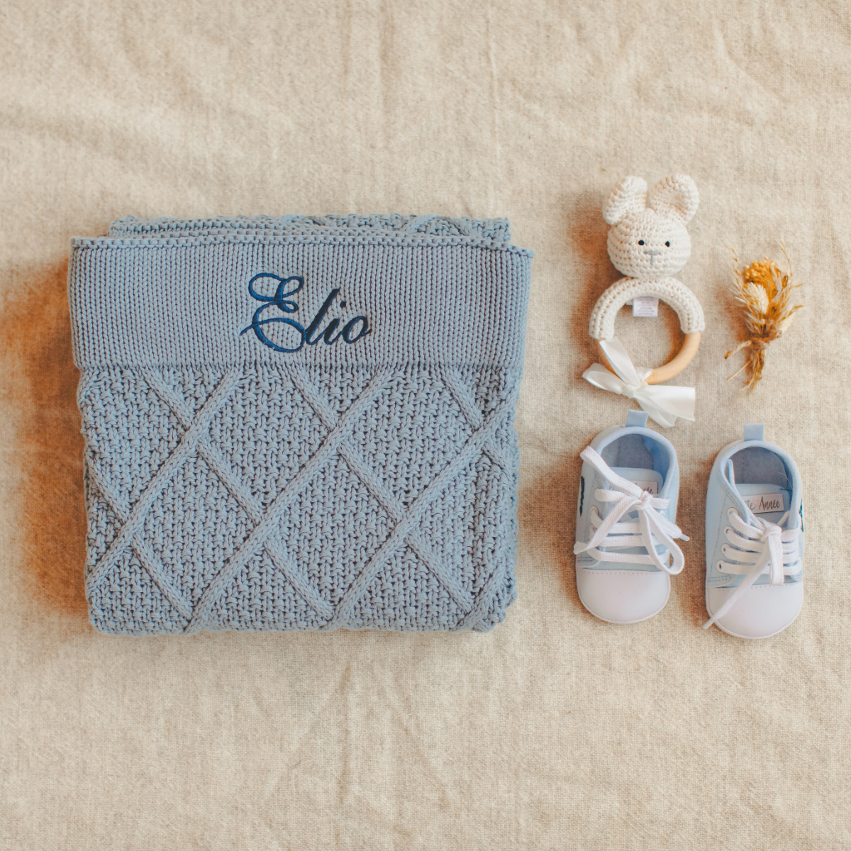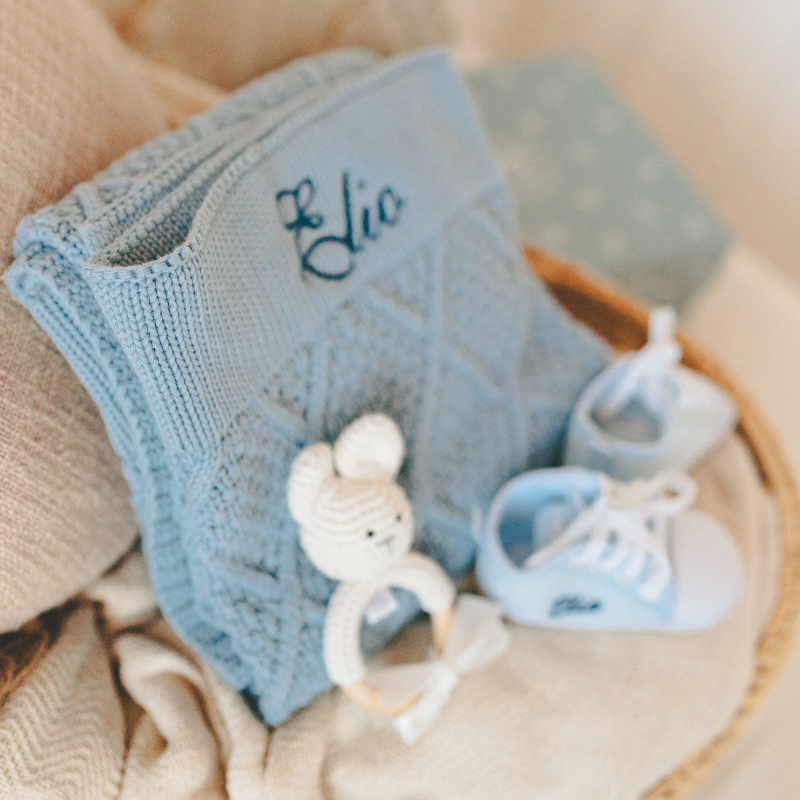 Baby shoes and/or blanket can be individually embroidered with the baby's name or initials. This creates a special, personalised baby gift that will be remembered for a long time.