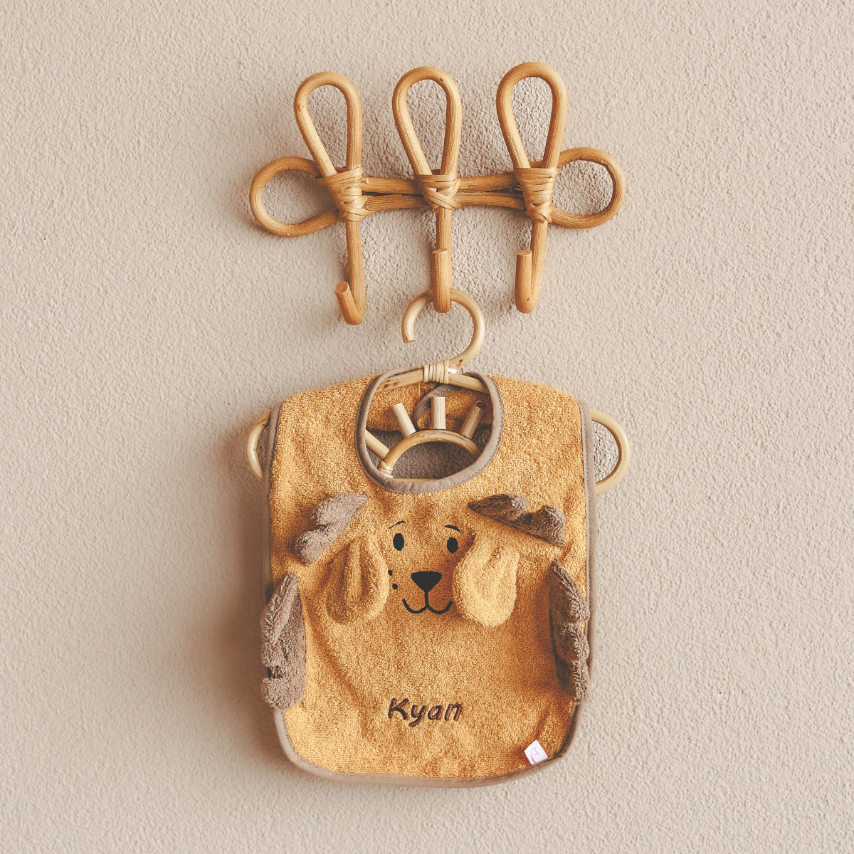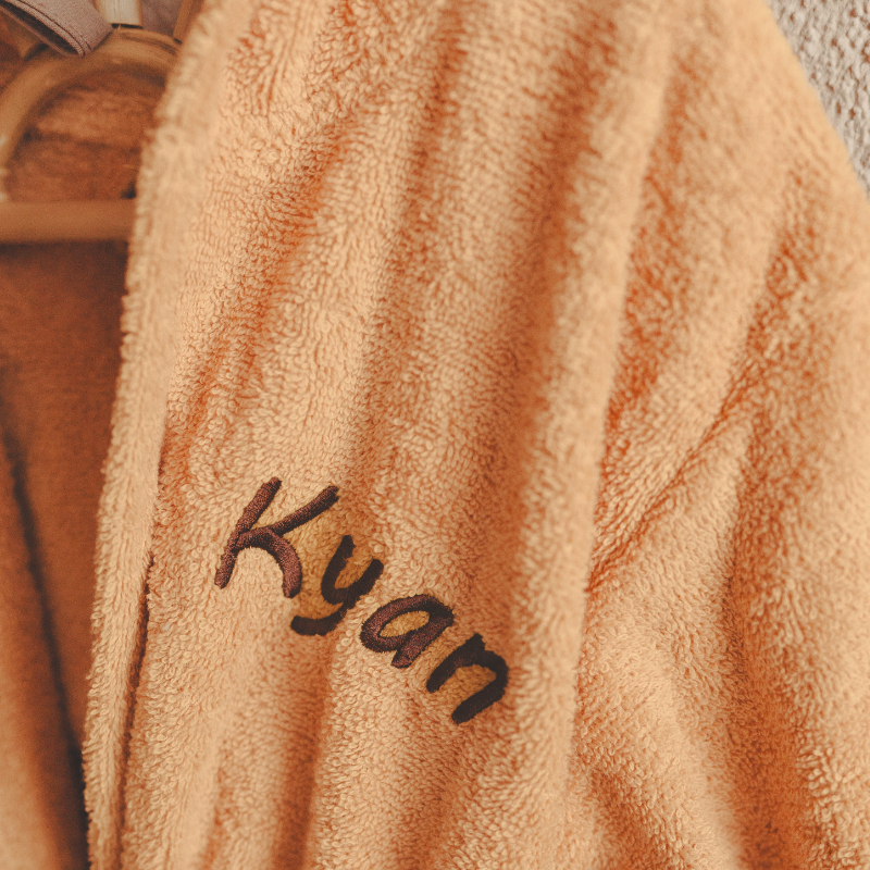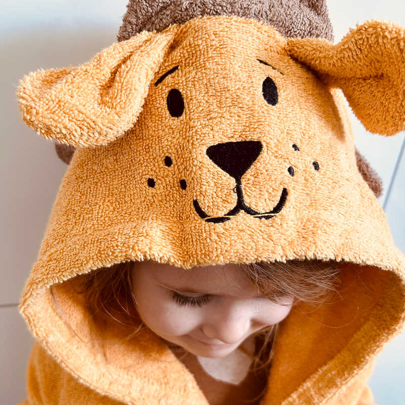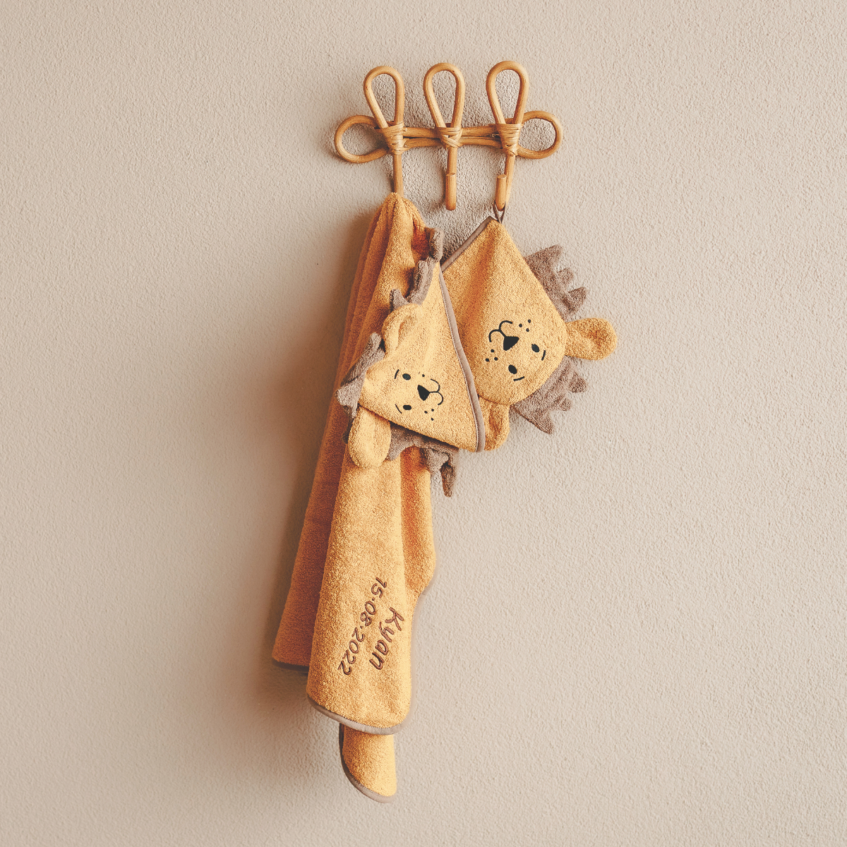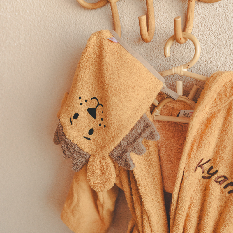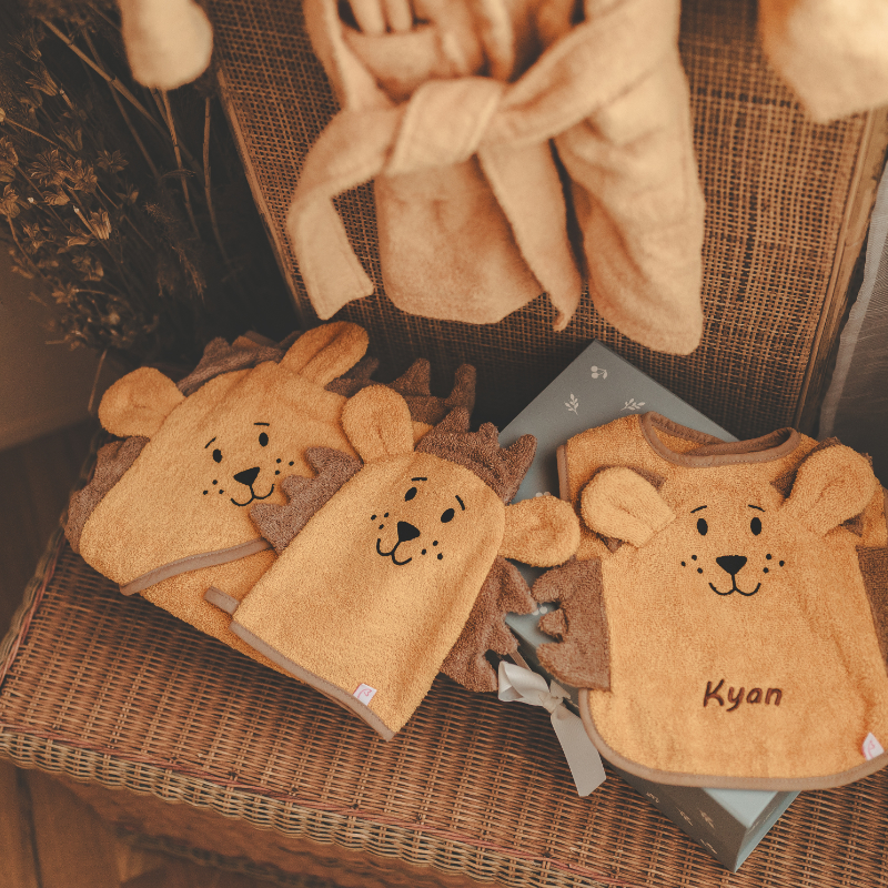 On request, we can personalise the bathrobe, hooded towel and bib with the child's name for a truly unique, personal gift. (Please note: the washcloth cannot be personalised.)