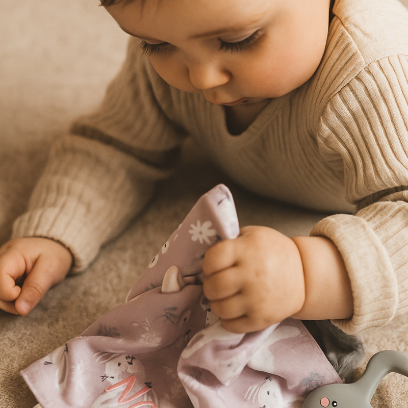 The silicon toy also helps to relieve the symptoms of teething. Play and calm down - this will make the crinkle cloth the most faithful companion whether at home or for traveling. The long loop over the corner can also be used to attach a dummy chain or clip to attach it (for example, to clothing or stroller)