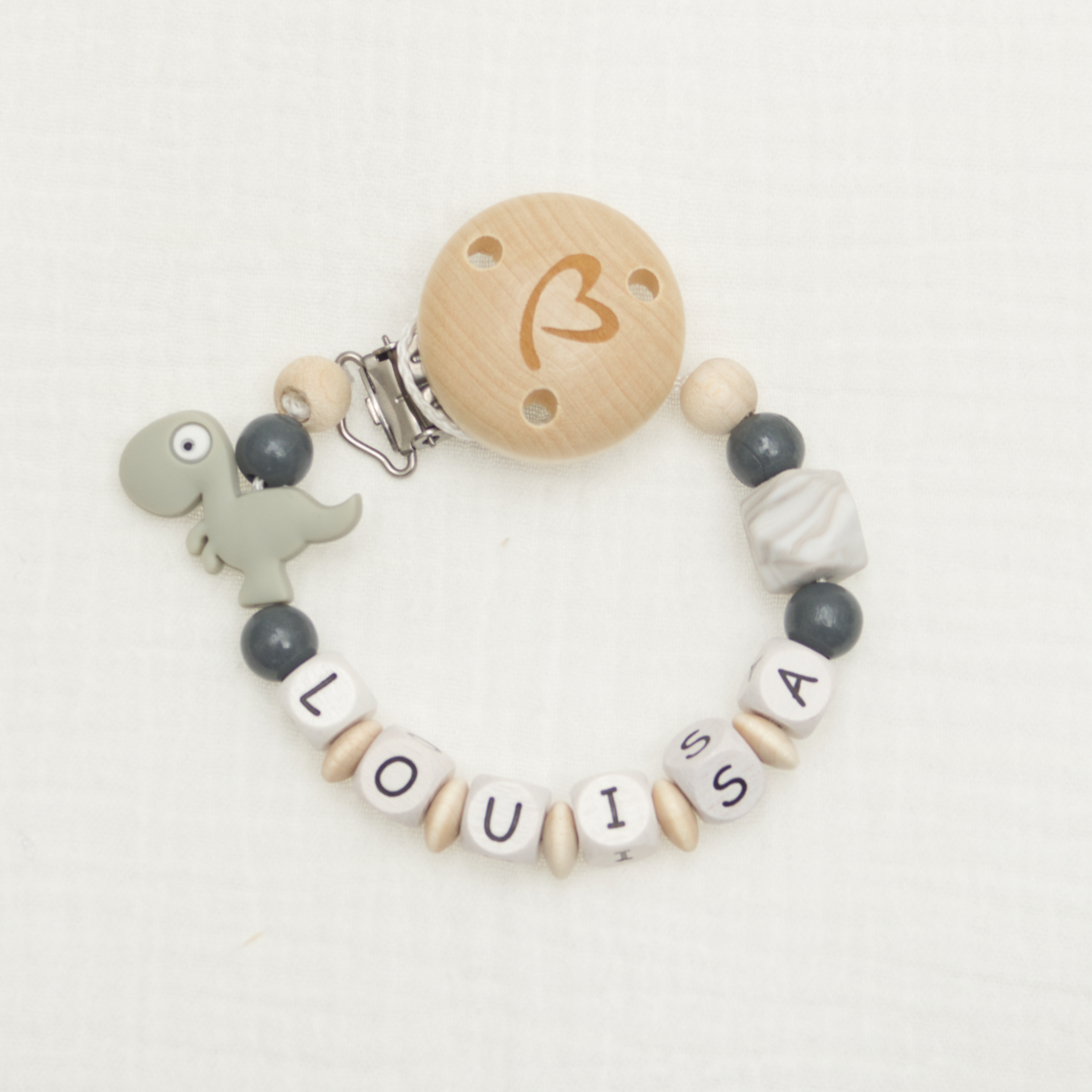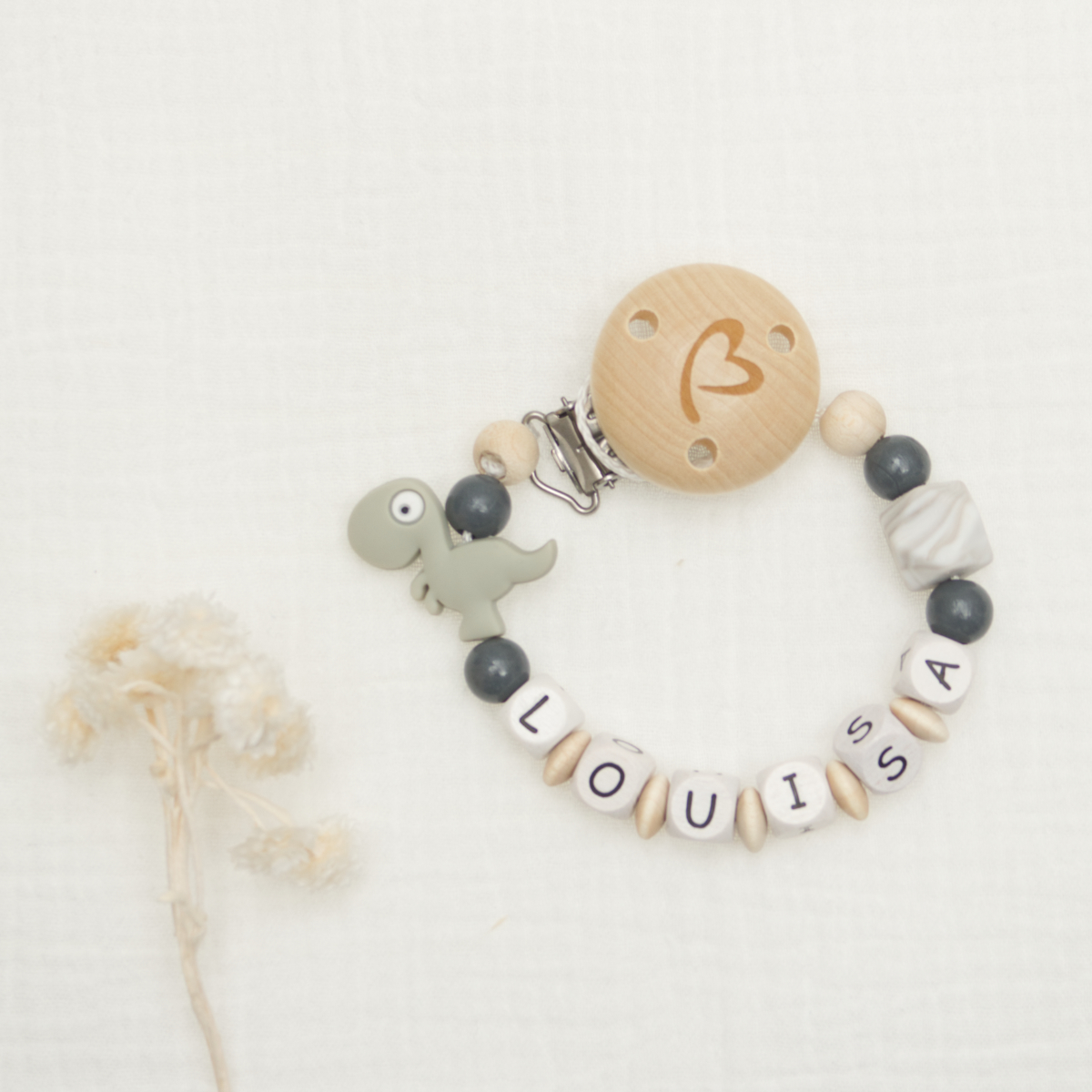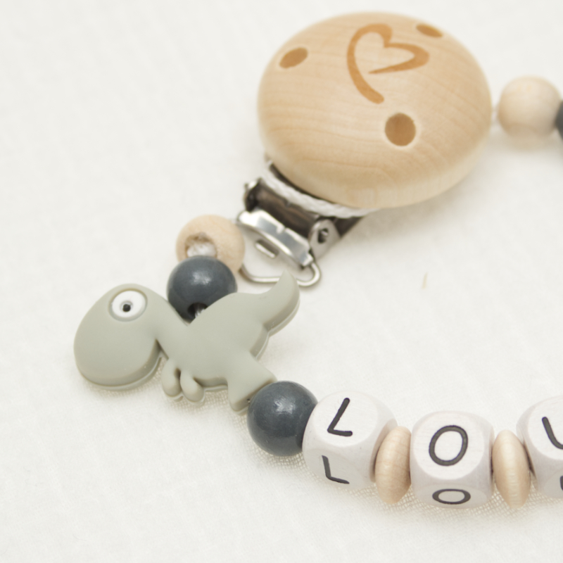 Cette sucette enchante avec son motif dino et ses perles assorties en silicone et en bois.