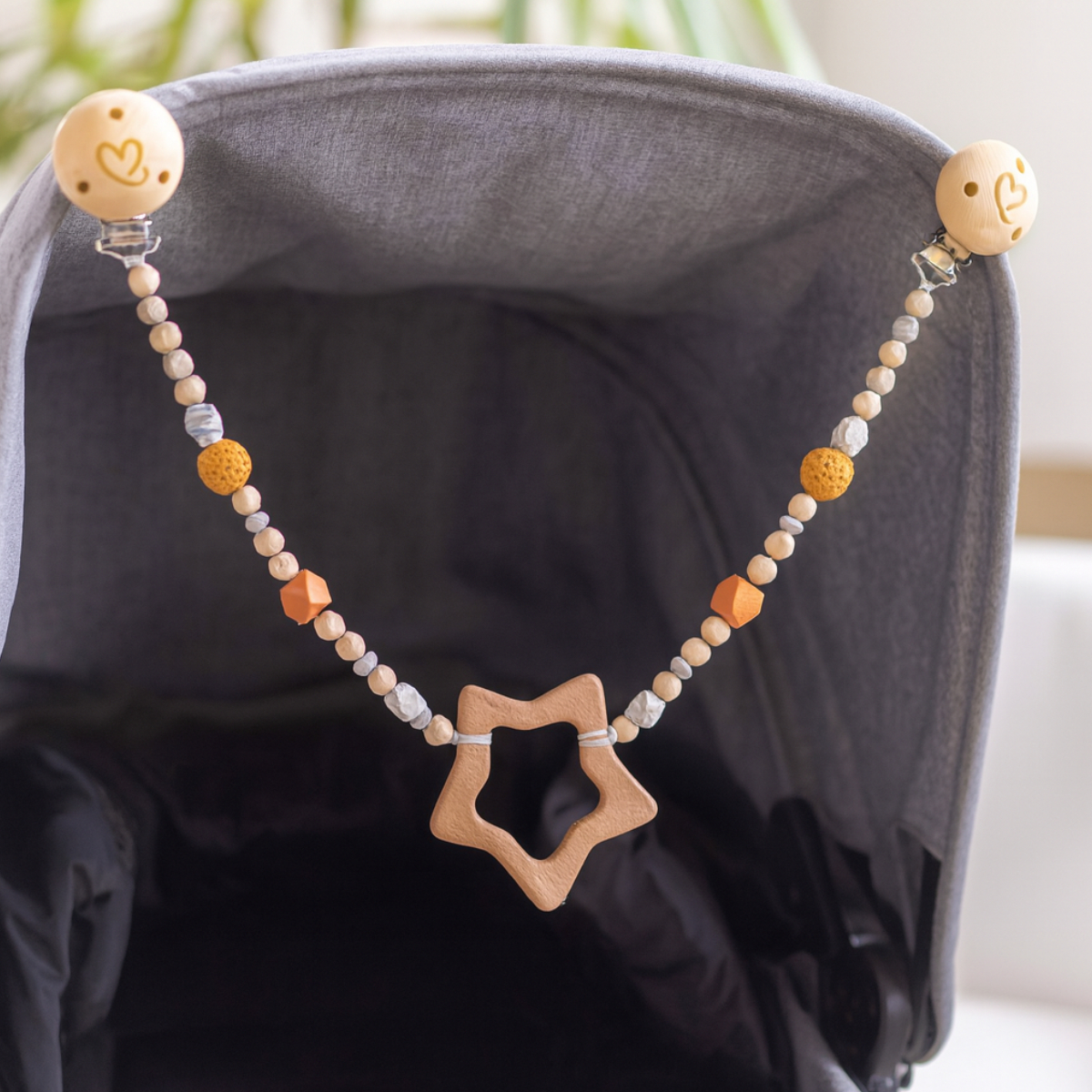 La chaîne est une magnifique combinaison de bois de hêtre non traité combiné à des perles en silicone et à crochet. Les clips de fixation permettent de l'attacher facilement à la capote de la poussette ou du landau.