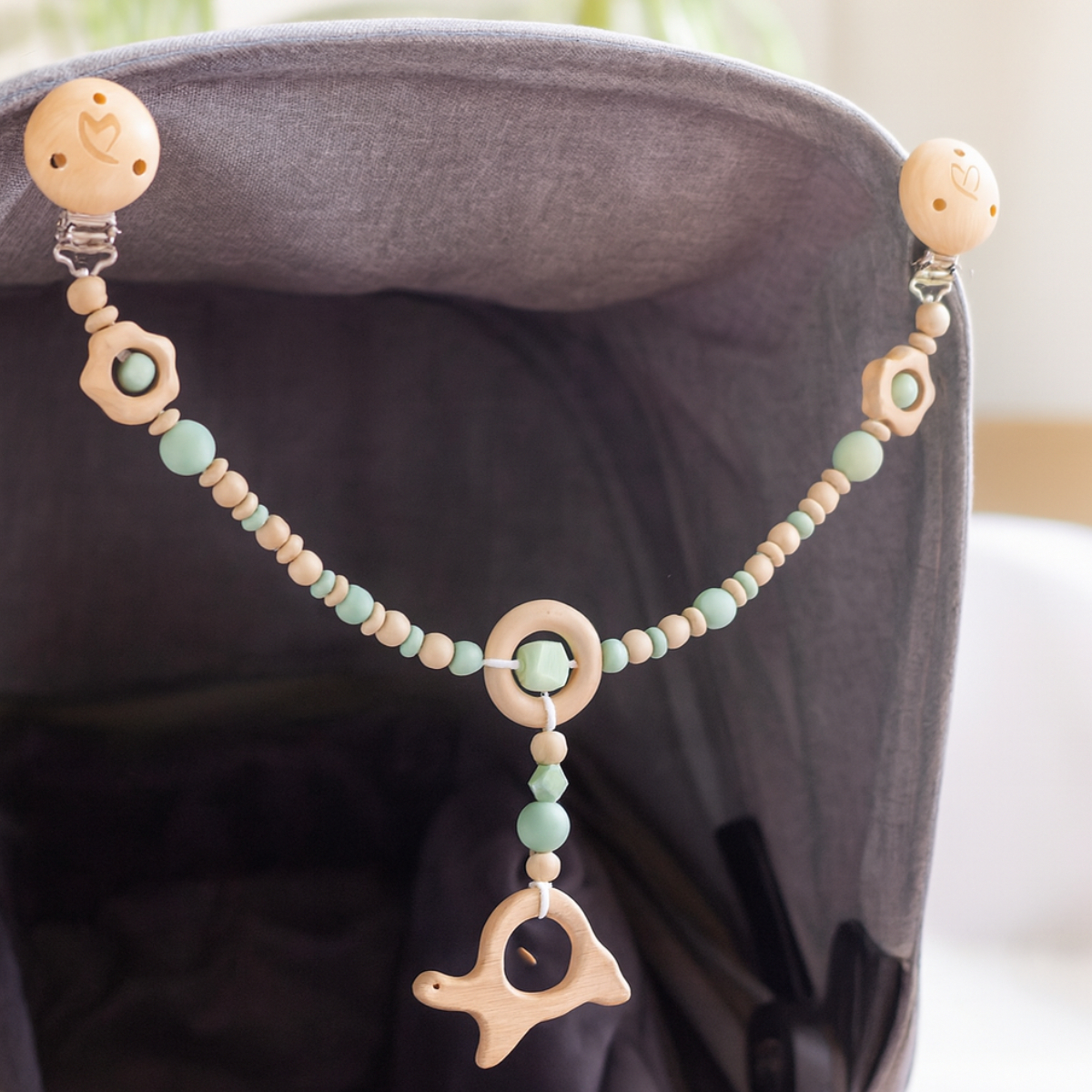 La chaîne est une magnifique combinaison de bois de hêtre non traité combiné à des perles en silicone. Les clips de fixation permettent de l'attacher facilement à la capote de la poussette ou du landau.
