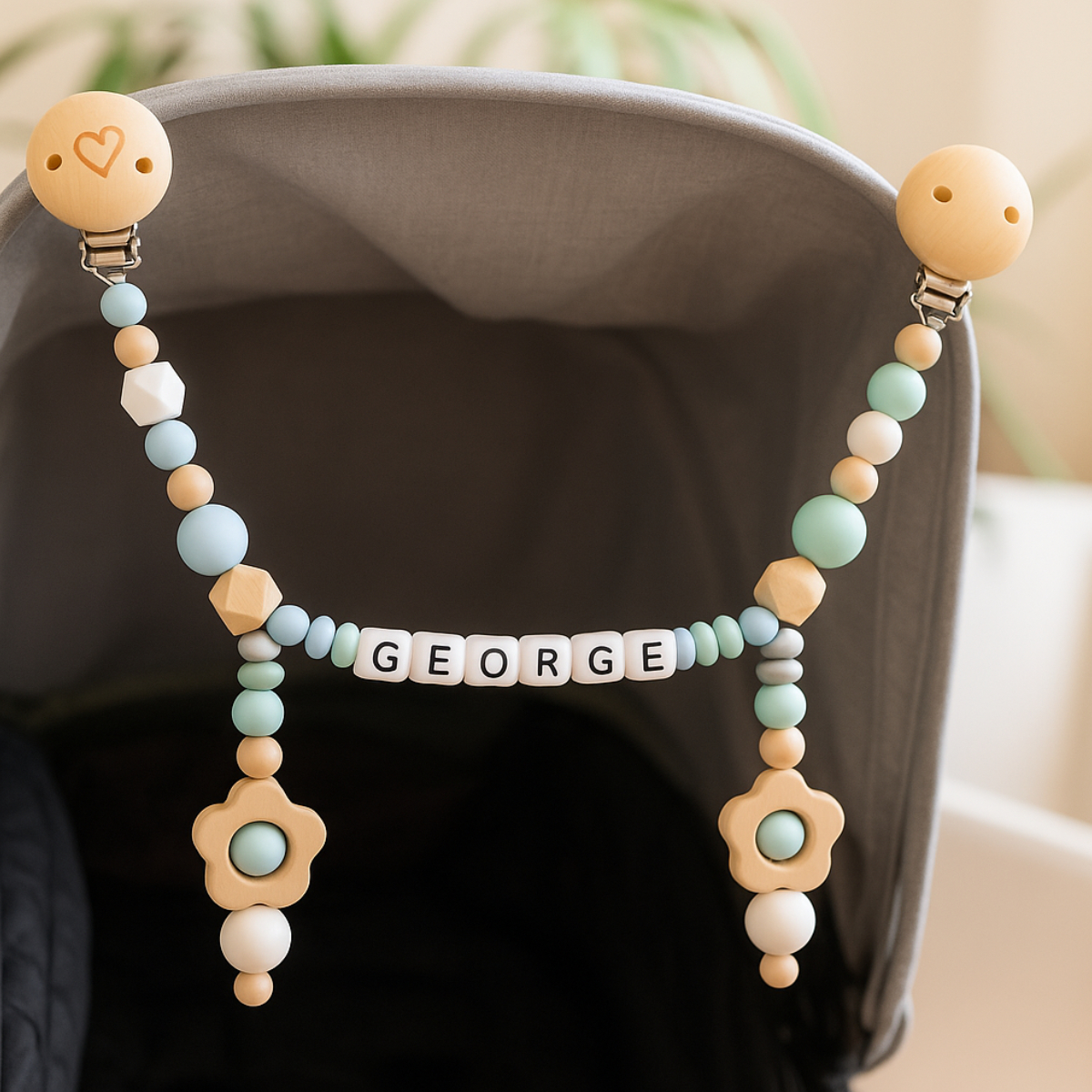 La chaîne est une magnifique combinaison de bois de hêtre non traité combiné à des perles en silicone. Les clips de fixation permettent de l'attacher facilement à la capote de la poussette ou du landau.