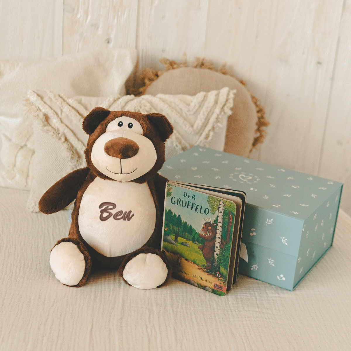 Sur demande, nous brodons le nom de votre choix sur la peluche. Ainsi, votre compagnon câlin devient un compagnon unique et un magnifique souvenir.